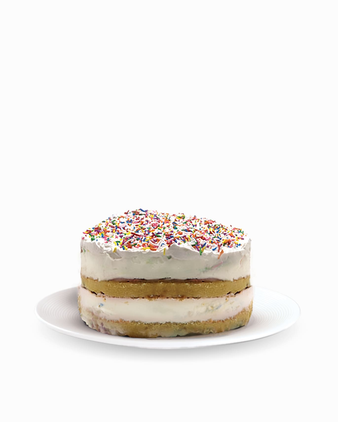 12 to 14 servings. A party in every bite! Layers of vanilla cake and creamy vanilla ice cream, loaded with rainbow sprinkles and finished with vanilla icing. Perfectly festive and fun.