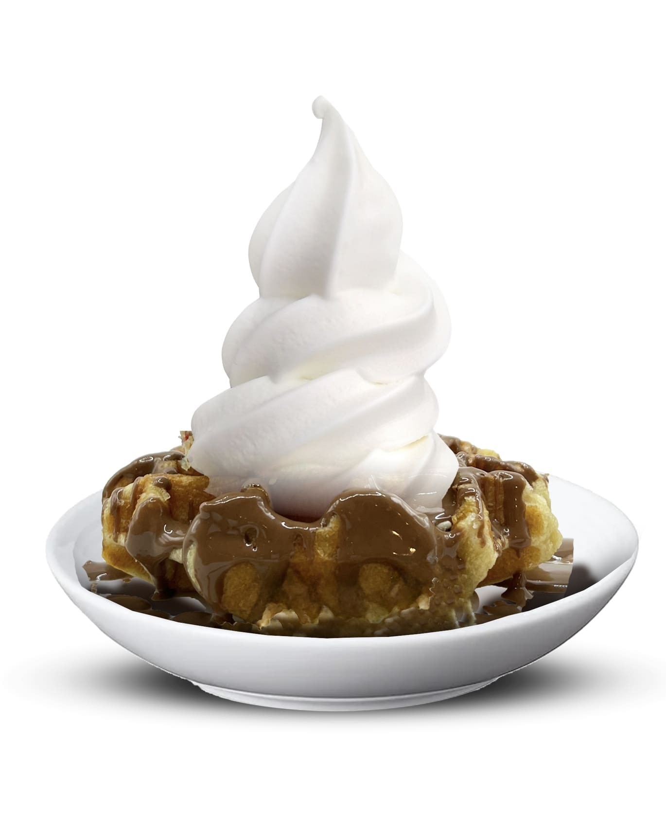 Belgian waffle drizzled with milk chocolate and topped with creamy vanilla soft-serve ice cream